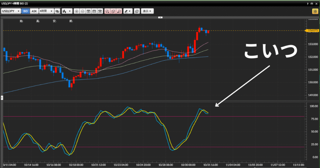 ストキャスティクスが80%を超えると、多くの初心者は「買われすぎだから下がる」と考えがちです。