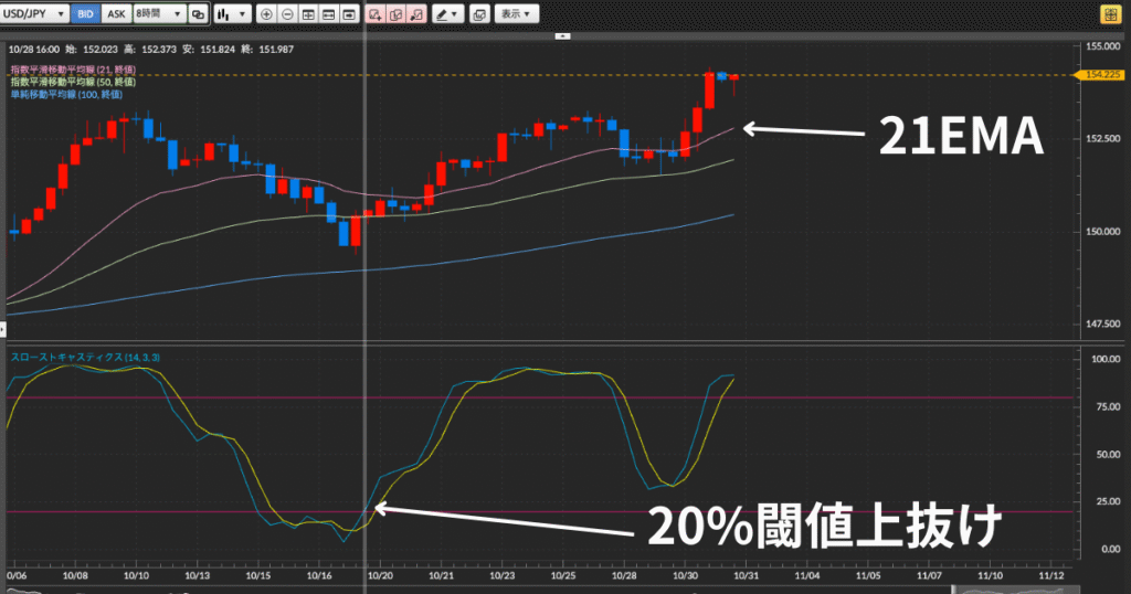 - ストキャスティクスが20%以下から上抜け