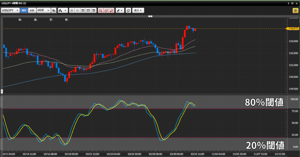 多くのトレーダーは、80%を“買われすぎ”・20%を“売られすぎ”の目安として使います。